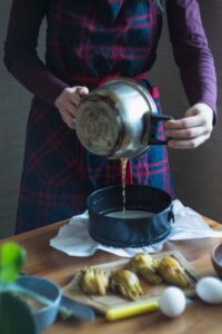 Assemble the cakes. Use a sharp knife to cut off the ends of four of the citrus fruits. Slice the citrus into very thin rounds, no thicker than 1/8". Remove any seeds from the rounds and place one small citrus round in the bottom of each sugared muffin cavity. (See Chef’s Notes for choosing/placing citrus.)
